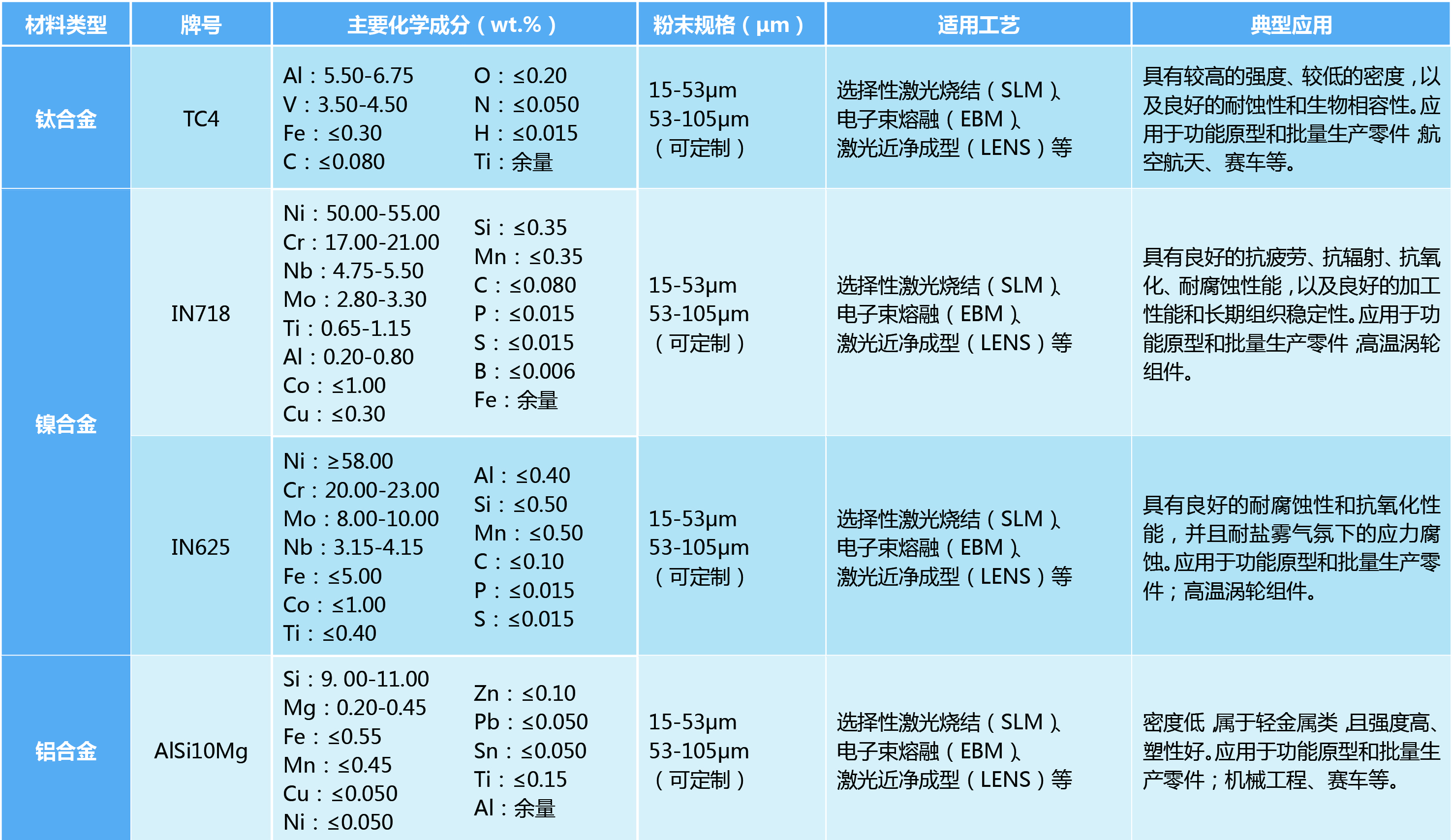 IESCAEP系列鈦合金、鎳基高溫合金和鋁合金等合金粉末適用于選擇性激光燒結(jié)(SLM)、電子束熔融(EBM)、激光近凈成型(LENS)等多種工藝,可滿足航空航天、軍工、船舶及核工業(yè)等多種特種行業(yè)領(lǐng)域的需求。